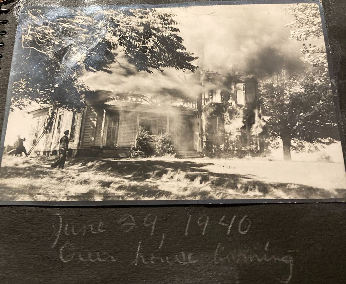 It’s written in pencil on black paper under a black and white photo of a large farmhouse on fire. One guy is walking toward the front near a tree, another guy is on a ladder, and a third is standing back seemingly waiting for instruction. Flames are pouring out of the windows, the glass is gone. There’s a haze of smoke near the second floor, the front porch is dark.